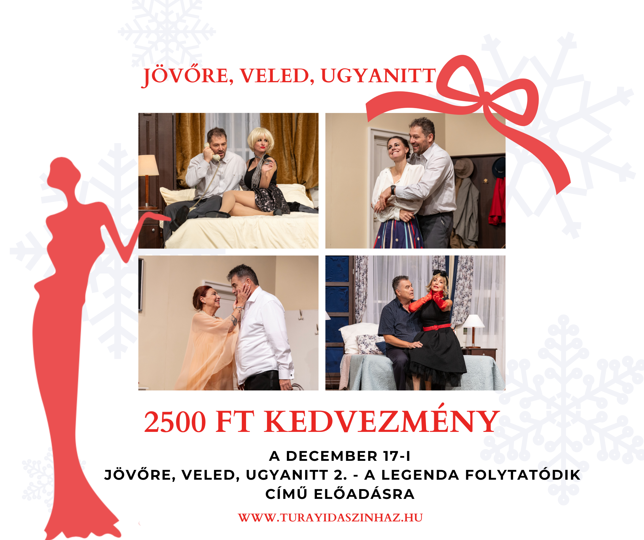 Aki jegyet vált vagy váltott a „Jövőre, veled, ugyanitt” című előadásunkra, a második részre, a december 17-i Jövőre, veled, ugyanitt 2-re, a jegyet 2500 Ft kedvezménnyel vásárolhatja meg!